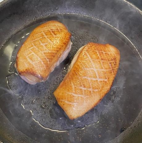 • 熱鍋熱油下鴨胸: 這樣外面焦了裡面還是生的,而且皮下的脂肪根本來不及融化就被封住,最後皮不脆,油又多。煎鴨胸一定要冷鍋下皮。
