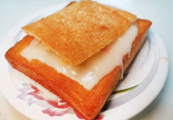 - 獨特造型:厚片吐司挖空、油炸成金黃酥脆的盒子,像棺材形狀(取其升官發財吉利意),噱頭十足。